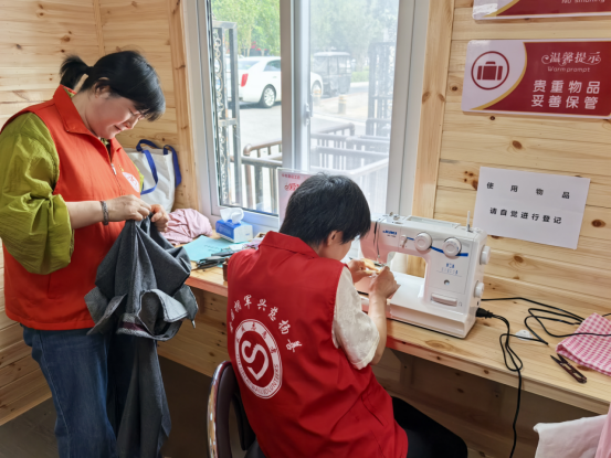 缝纫机哒哒作响,志愿者彭凤菊、蔡香婷正帮居民修改裤脚、缝补衣服。彭凤菊笑称:“从小练就的缝补手艺,没想到还能派上用场!”老人拿着补好的衣服满意离开。