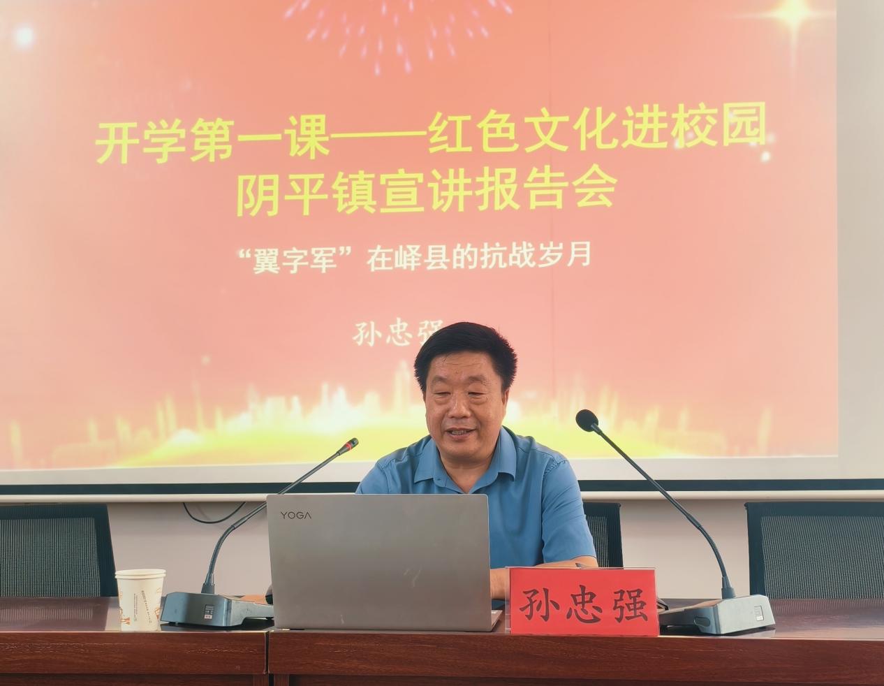 9月5日,受峄城区革命老区建设促进会、区教育和体育局、区党史研究中心、区老干部活动中心指派,峄城区学雷锋志愿者联合会副会长兼秘书长孙忠强同志到山东省第一所雷锋学校一阴平镇中学进行“开学第一课——红色文化进校园”宣讲活动。
