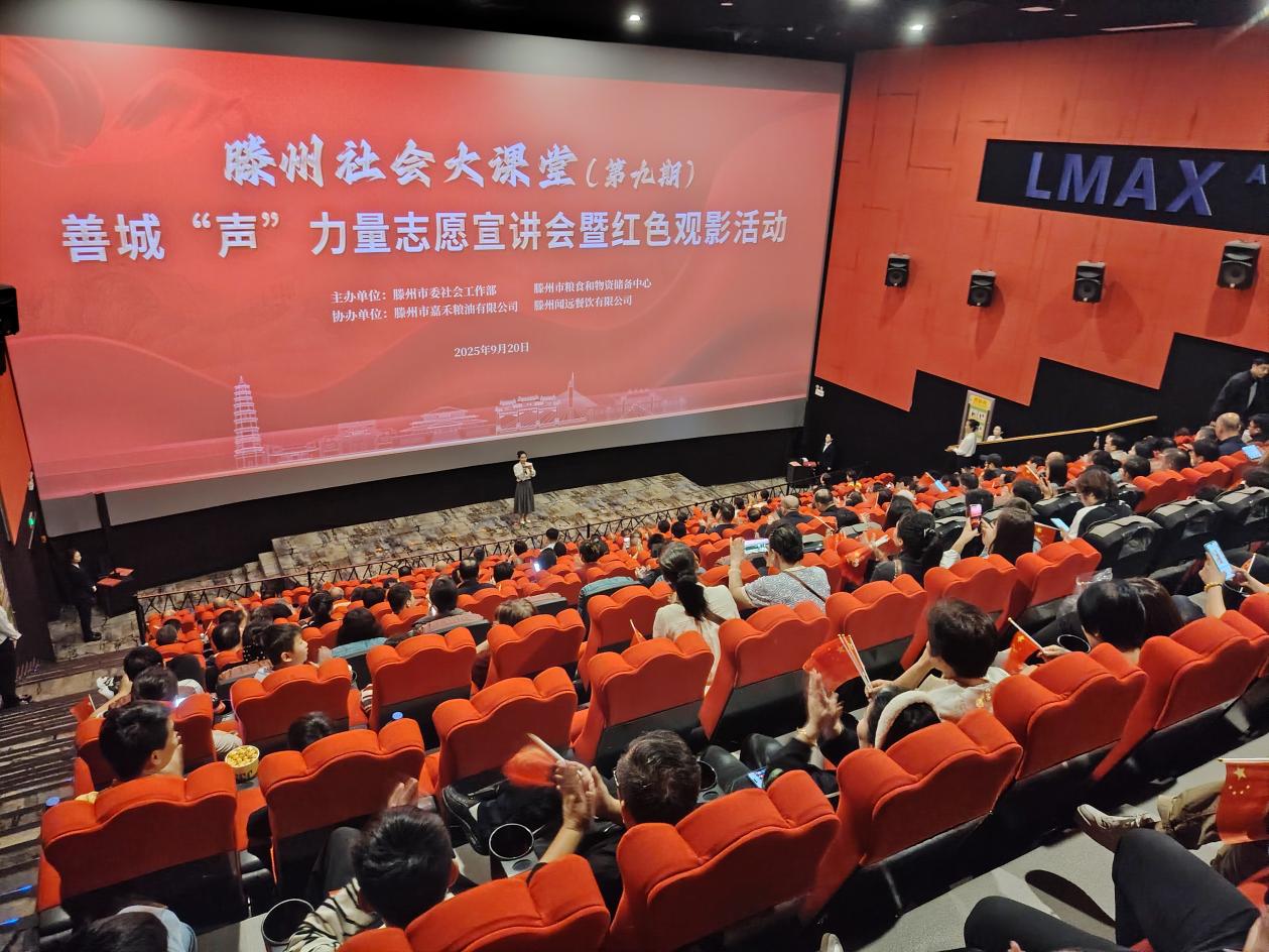 为传承红色文化,弘扬雷锋精神,庆祝中华人民共和国成立76周年,纪念中国人民抗日战争暨世界反法西斯战争胜利80周年,结合第二十三个公民道德宣传日活动,9月20日上午,滕州市学雷锋志愿者联合会组织志愿者在美铭广场上影国际影城,积极参与滕州社会大课堂(第九期)——善城“声”力量志愿宣讲会暨红色观影活动。
