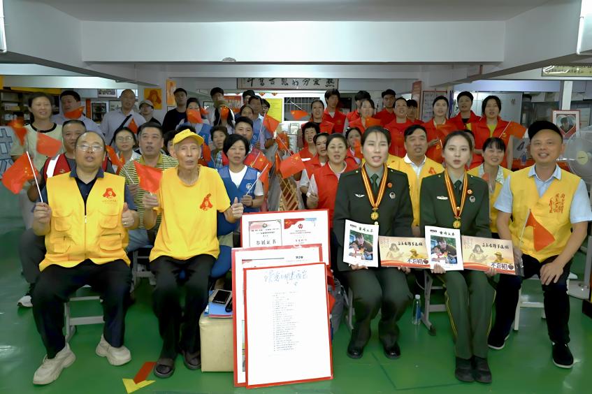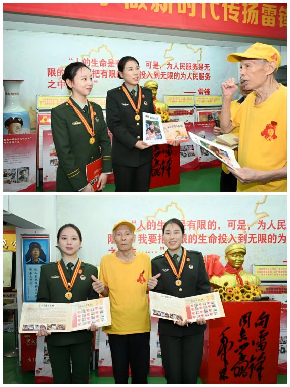 中国好人、金华雷锋事迹馆创办人曹荣安为杜佳怡、张婉煜佩戴雷锋奖章并赠送精心准备的礼物。他感慨道:“‘93阅兵’当天,我在馆内全程观看。作为一名退役52年的老兵,我为国家的强大倍感自豪。今天能邀请到两位分享经历,意义非凡。”